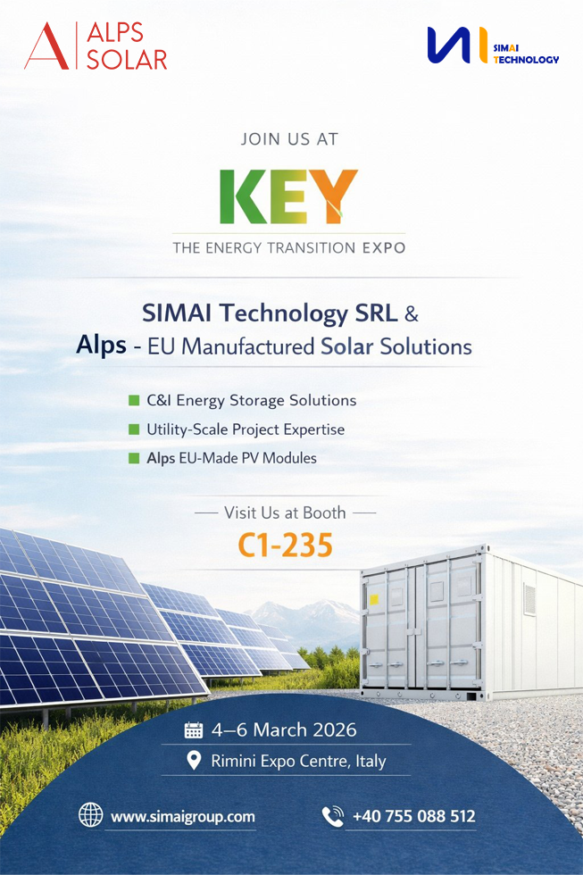 La KEY Energy Rimini 2026, SIMAI va prezenta în mod proeminent Alps, un brand fotovoltaic proprietar produs în UE, dezvoltat în cadrul cadrului strategic de integrare verticală SIMAI.