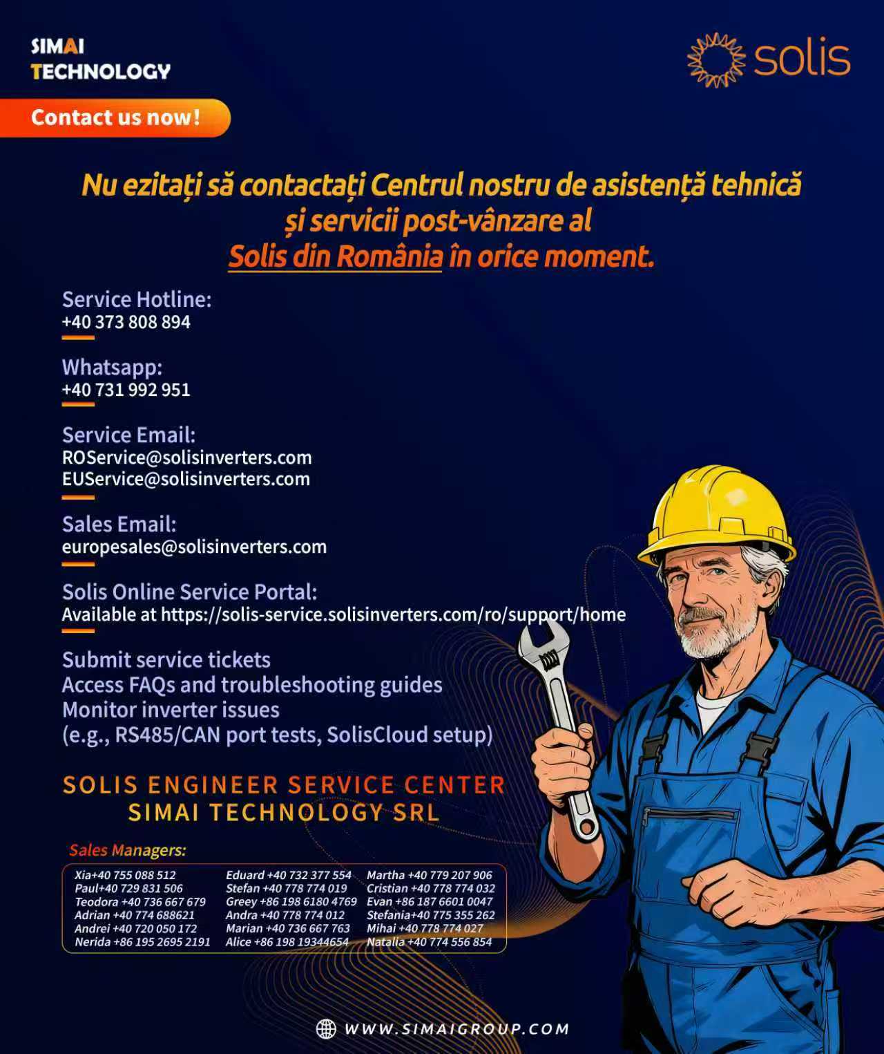 Simai Technology și Solis sunt dedicate să ofere asistență tehnică de top și servicii post-vânzare. Salvați acest card de contact pentru a ajunge instantaneu la echipa noastră din România prin intermediul liniei noastre fierbinți, WhatsApp sau Portalul de servicii online pentru depanare, întrebări despre vânzări și bilete de asistență.